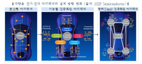 보고서는 전장부품 증가 및 ADAS의 발전에 따른 연산량 증가, 전기차의 성장 등으로 E/E 아키텍처가 변화하고 있다며 개별 기능을 통제하는 전자제어유닛(ECU)의 개수가 증가하고 ECU 간 배선, 통신이 복잡해지면서 이에 동반하는 하드웨어, 소프트웨어의 설계와 양산 비용도 증가하고 있다고 설명했다.