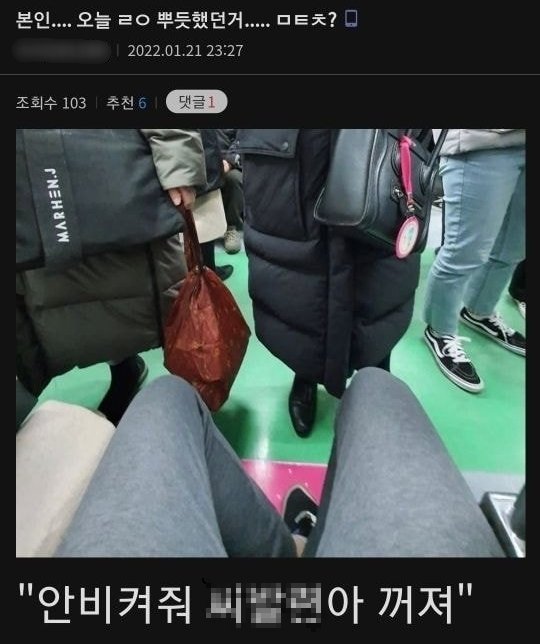 A씨는 "안 비켜줘, XXX아 꺼X"라는 욕설과 함께 사진 한 장을 공개했다. 사진 속 임산부 배려석에 앉은 글쓴이 A씨의 맞은 편에는 가방에 임산부 배지를 부착한 한 승객이 서 있었다.