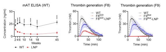연구팀은 안티트롬빈 유전자에 대한 유전자가위(CRISPR) mRNA를 지질나노입자(LNP)로 전달하는 방법을 통해 혈중 안티트롬빈 양을 70% 이상 감소시키고 이 효과가 최소 10개월 이상 지속하는 것을 확인했다.