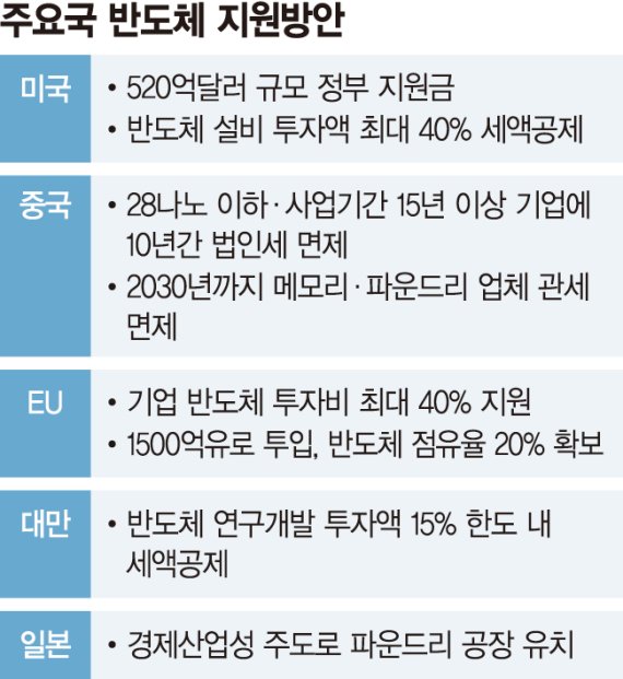 하지만 최근 국회 문턱을 넘은 정부가 추진한 '국가첨단전략산업 경쟁력 강화 및 보호에 관한 특별법'(반도체특별법)은 법안 심사과정에서 수도권 대학 반도체학과 정원확대 내용이 수도권에 기반을 둔 국회의원들의 반발에 제외됐다. 이에 삼성전자는 고려대, KAIST, 포스텍 등 국내 7개 대학과 협약을 맺어 대학 내 반도체 계약학과를 만들며 인재 육성을 위한 자구책을 모색하고 있다. 파격적 세제혜택도 찾아보기 어렵다. 미국은 자국 내 반도체 시설에 투자하면 투자금액의 25%를 환급하고 EU는 반도체 투자금액의 40%를 정부가 지원하는데, 한국은 대기업 시설투자 공제혜택이 6%에 불과하다.