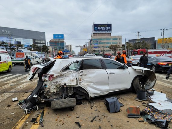해당 차량은 교통섬 내에 있던 나무와 신호등 등을 들이받은 뒤 길 건너편에 있던 승용차 2대를 추가로 들이받았다.