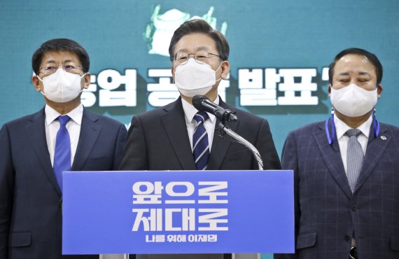 [포천=뉴시스] 국회사진기자단 = 이재명 더불어민주당 대선 후보가 25일 오전 경기 포천 농업기술센터에서 농업 공약을 발표하고 있다. 2022.01.25. photo@newsis.com [서울=뉴시스]전진환 김지현 기자 = 이재명 더불어민주당 대선 후보는 25일 오전 경기 포천 농업기술센터에서 농어촌 공약 발표식을 갖고 "지방정부의 선택과 지역의 여건에 따라 1인당 100만원 이내의 농어촌 기본소득을 지급하겠다"고 말했다. 또한 이장 수당 20만원, 통장 수당 10만원을 임기 내에 인상하겠다고도 했다.