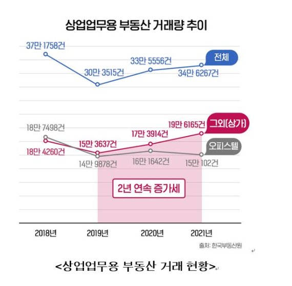 상업 업무용 부동산은 2018년 37만1758건을 기록한 후 이듬해 30만3515건으로 거래가 줄었지만, 이후 2년 연속 상승세를 이어가고 있다.