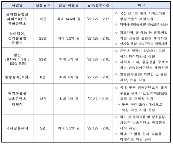 올해는 2021년보다 103억 원을 증액한 총 315억 원의 예산을 투입해 △온라인동영상서비스(OTT) 특화(116억 원), △방송형식(포맷, 40억 원), △수출용 재제작 및 현지화 지원(22억 원), △뉴미디어, 신기술 융합(64억 원), △일반(드라마·다큐·공공, 58억 원), △국제공동제작(15억 원) 등 총 6개 부문에서 87편 내외 규모로 지원할 예정이다.