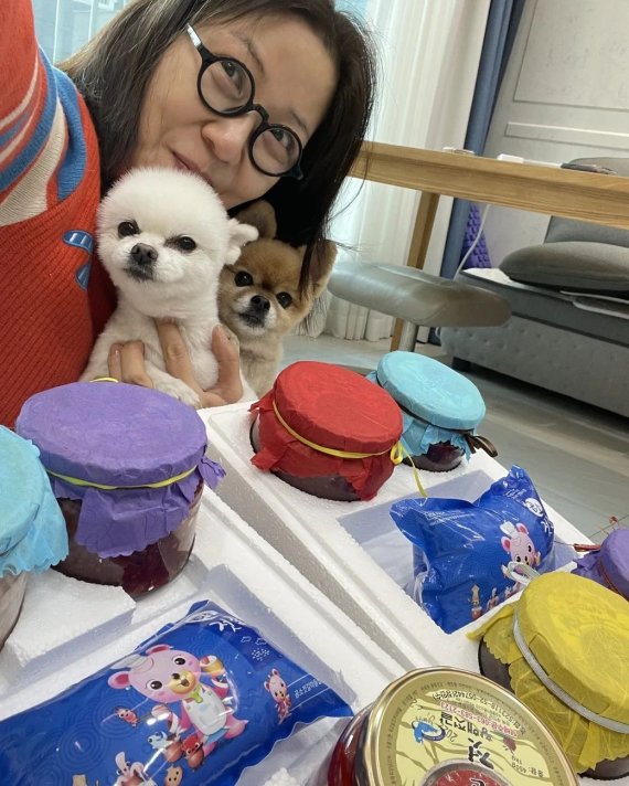 공개된 사진 속 서이숙은 반려견들을 안은 채 아이유가 보내온 젓갈 선물세트를 앞에 두고 인증샷을 남기는 모습이다.