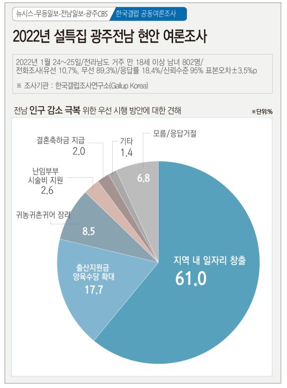 27일 뉴시스 광주전남본부와 무등일보, 전남일보, 광주CBS가 여론조사 전문기관 한국갤럽에 의뢰해 지난 24~25일 이틀 간 전남에 거주하는 만18세 이상 남녀 802명을 대상으로 전남지역 인구 감소 극복을 위한 대책을 조사한 결과 응답자의 61.0%가 '지역 내 일자리 창출'을 꼽았다.