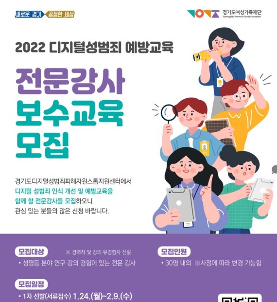 [수원=뉴시스]박상욱 기자 = 경기도여성가족재단은 디지털 성범죄 인식 개선과 예방교육을 할 전문강사 30명 내외를 모집한다고 2일 밝혔다.
