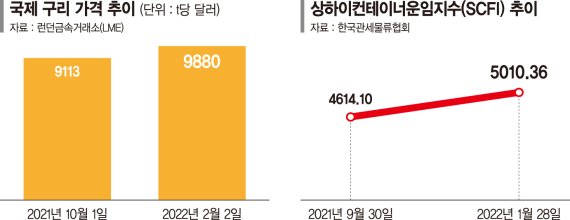3일 관련 업계에 따르면 삼성·LG전자는 지난해에 이어 올해도 원자재·물류비 상승세가 이어질 것으로 전망했다. 삼성전자 관계자는 "물류 수요가 높은 상황에서 오미크론 변이 바이러스 등으로 인해 선박이 부족하고, 인플레이션 여파로 원자재 가격 강세가 이어지고 있다"면서 "올해도 재료비와 물류비 증가 리스크가 지속될 것으로 예상된다"고 우려했다.