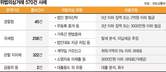 위법의심 거래 570건을 유형별로 살펴보면 △계약일 거짓신고·소명자료 미제출 등 322건 △가족 간 편법증여·법인대표 자금 차입 등 258건 △법인 명의신탁·무등록 중개 등 45건 △대출용도 외 유용 2건 등이다. 1건의 거래에서 다수의 위반 사례들이 나오기도 했다.