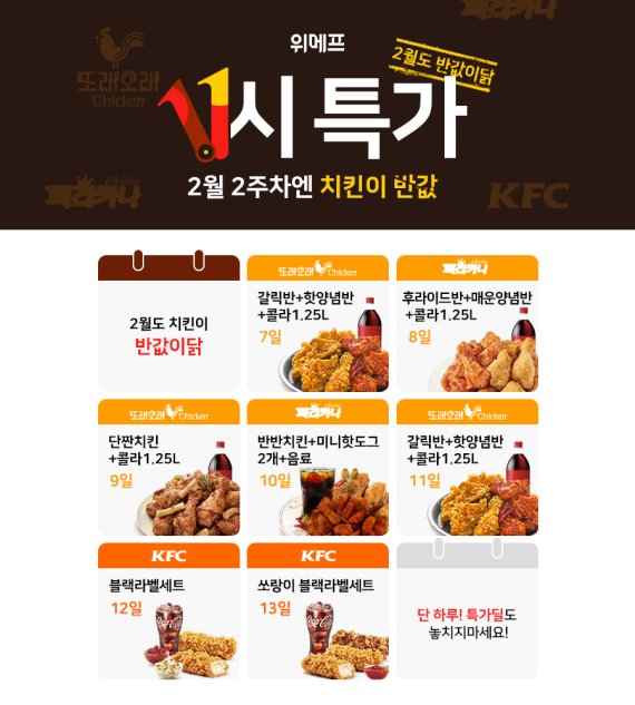 위메프는 7~13일 11시특가를 열고, 매일 오전/오후 11시 치킨 e쿠폰을 50% 할인한다고 7일 밝혔다. 12~13일 주말 양일간은 20%를 추가 할인, 정상가 대비 70% 저렴하게 판매한다.