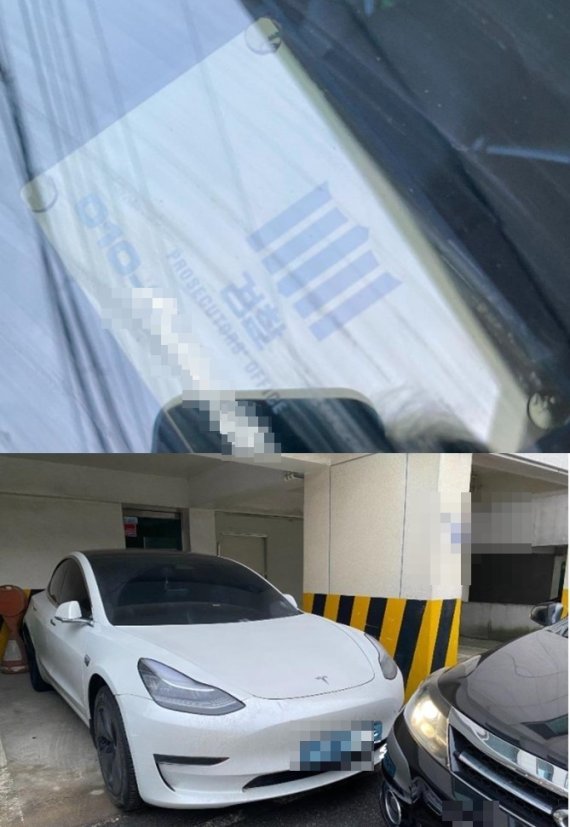 A씨가 공개한 사진에 따르면 흰색 테슬라의 앞 유리에 붙은 연락처 표지판에는 검찰을 상징하는 로고와 영문 그리고 휴대전화 번호가 적혀있었다.