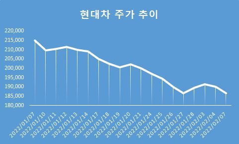 업계에서는 반도체 수급난을 주가 약세의 원인으로 꼽는다. 올 1월 현대차는 전년 동기 대비 12.1% 감소한 28만2204대를 판매했다. 지난 달 기아의 글로벌 판매량도 전년 동기 대비 5.7%가 빠진 21만2819대를 팔았다.
