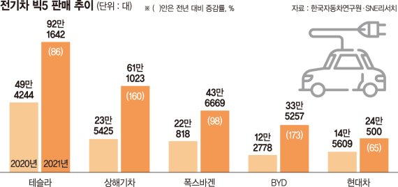 테슬라가 전년대비 86% 증가한 92만1642대를 판매하며 1위를 차지했고 상해기차는 61만1023대, 폭스바겐 43만6669대, BYD 33만5257대로 뒤를 이었다. 현대차그룹은 전년대비 65% 증가한 24만500대의 전기차를 판매하며 5위를 차지했다. 전기차 모델별 판매량은 테슬라 모델3가 47만대로 1위에 올랐고 모델 Y가 42만6000대로 2위, 상해GM우링 훙광 MINI는 41만9000대, BYD 한이 8만7000대, 체리기차 eQ1이 7만7000대 순으로 나타났다.