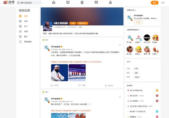 7일 중국판 트위터 격인 웨이보에서는 '황대헌 반칙(黄大宪犯规)'과 '우다징(중국 선수)이 치였다(武大靖被撞)' 해시태그가 각각 1000만 공유를 넘기며 실시간 검색어 1, 2위에 오르고 있다. '쇼트트랙 반칙(犯规 短道)' 해시태그는 400만 공유를 넘기며 8위를 기록했다.