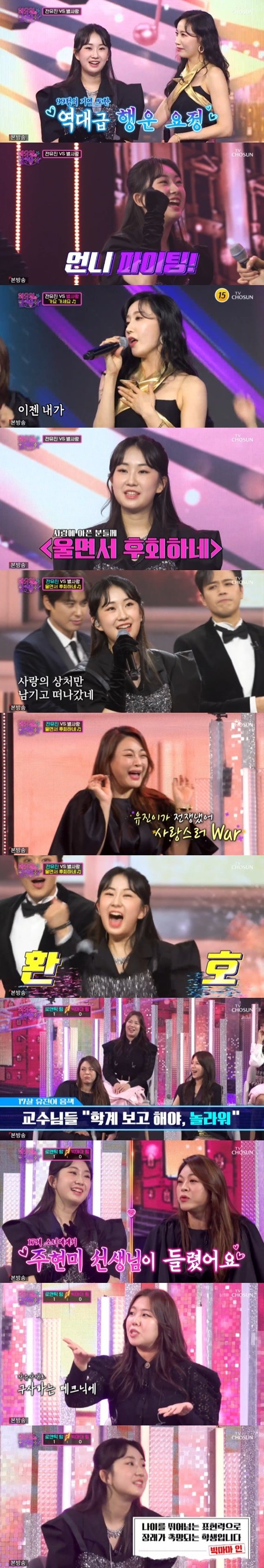 지난 방송에서 '행운 요정'으로 출격해 99점을 기록하며 폭발적인 반응을 얻은 전유진이 정식 대결에 나섰다. 전유진은 장민호 팀 별사랑의 지목으로 첫 번째 대결 무대에 올랐다. 별사랑이 전유진에게 "열심히 하고, 언니가 이길게"라고 선전 포고하자, 전유진은 "언니 파이팅!"을 큰소리로 외치며 기선을 제압했다.