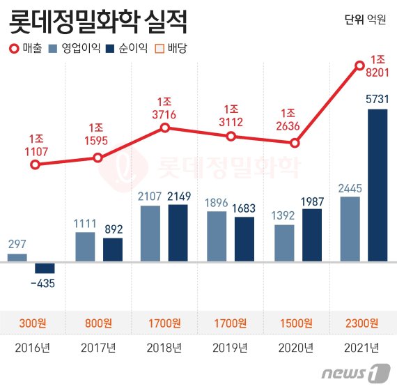 롯데정밀화학은 롯데 품에 안긴 이후 빠르게 성장했다. 영업이익(연결기준)은 2016년 297억원에서 지난해 2445억원으로 8배 이상 늘었다. 같은 기간 당기순이익은 적자(435억원)에서 5731억원으로 흑자 전환했다. 천연가스 가격 상승과 경기 회복에 따른 전방사업 수요 증가 효과를 톡톡히 누렸다.