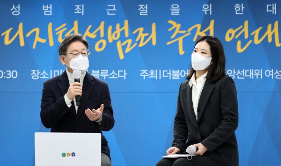 행사에서 이 후보는 민주당 선대위 디지털성범죄근절특위 위원장으로 합류한 박지현 활동가로부터 'n번방 사건' 추적 과정에 대해 듣고 디지털 성범죄 근절에 대한 의견을 나눴다.