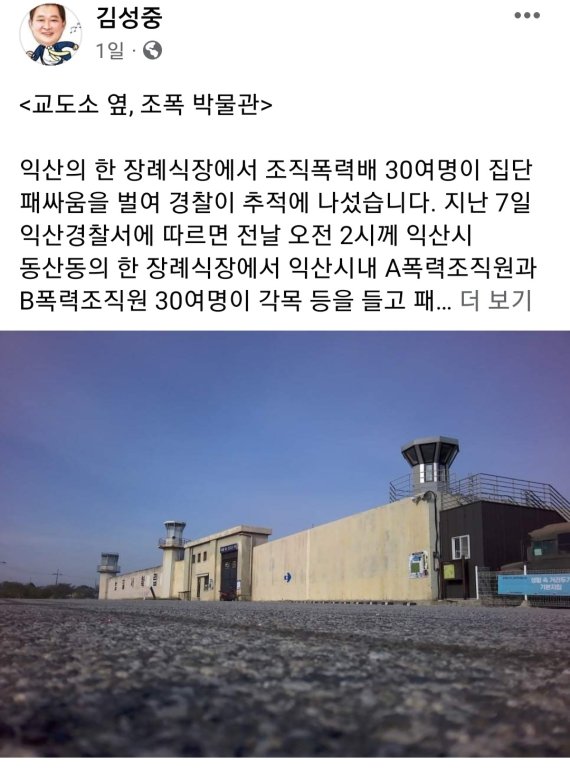 김 후보는 페이스북 올린 ‘교도소 옆, 조폭 박물관’ 글에서 “지난 7일 새벽 익산의 한 장례식장에서 관내 조폭 폭력배 2개파 조직원 30여 명이 패싸움을 벌여 경찰이 수사에 나섰다”고 운을 뗀 뒤 “조직폭력배는 이권과 이익을 목적으로 폭력을 행사하는 범죄 조직을 말하는데, 익산에는 배차장파·구시장파·삼남배차장파·역전파·중앙동파 등 6개 파가 있다고 알려졌다”고 소개했다.