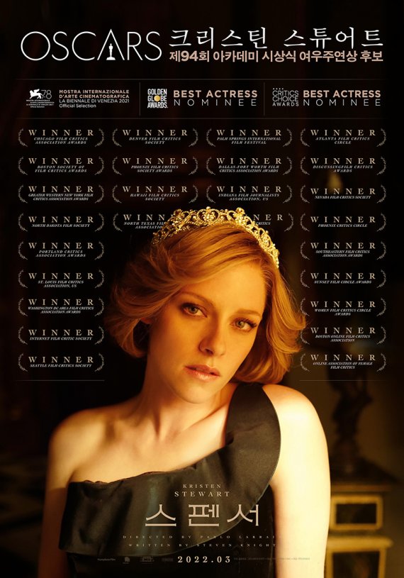 '스펜서'에서 다이애나 왕세자비로 변신한 크리스틴 스튜어트는 생애 처음으로 아카데미 여우주연상 후보에 지명됐다. 전 세계 영화제에서 여우주연상 수상을 이어가며 화제를 모은 크리스틴 스튜어트는 2022 골든글로브 여우주연상 후보에 이어 2022 아카데미 시상식에서도 여우주연상 후보에 올랐다.