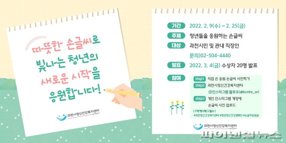 과천시정신건강복지센터는 ‘따뜻한 손글씨 청년 응원글 캠페인’을 9일부터 오는 25일까지 과천시정신건강복지센터 인스타그램 계정을 통해 진행한다.