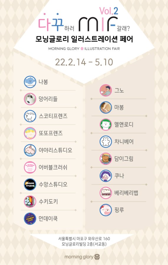 모닝글로리 관계자는 "모닝글로리 일러스트레이션 페어는 젊음과 열정으로 대표되는 홍대 경의선 책거리 인근의 모닝글로리 사옥에서 진행해 일러스트와 굿즈에 관심 있는 소비자들의 방문이 기대된다"며 "3개월 단위로 새로운 작가들과 연중 상시 진행되는 페어로 다꾸족들이 즐겁고 편하게 찾는 장소가 되기를 바란다"고 말했다.