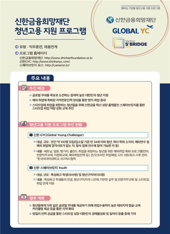 신한금융희망재단은 '신한 글로벌 영 챌린저' 프로그램을 통해 매년 해외 취업을 원하는 청년 100여명을 대상으로 다양한 교육과 취업 연계를 지원하고 있다.