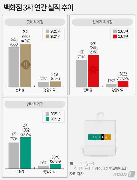 먼저 1위 사업자 롯데백화점은 코로나19 여파에도 해외패션(명품) 호황에 힘입어 완연한 실적 회복세를 보였다. 지난해 영업이익은 6.4% 증가한 8350억원을 거뒀으며 매출은 8.8% 증가한 2조8880억원을 올리며 1위 사업자의 자존심을 지켰다.