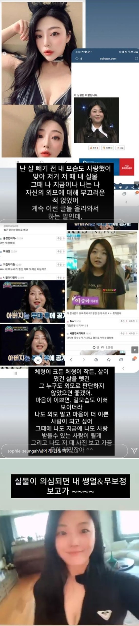 이승아는 "그때나 지금이나 나는 나. 외모에 대해 부끄러운 적 없었다"라며 "계속 이런 글들 올라와서 하는 말인데, 체형이 크든 체형이 작든, 살이 쪘건 살을 뺐건, 그 누구도 외모로 판단하지 않았으면 좋겠어"라고 심경을 밝혔다.