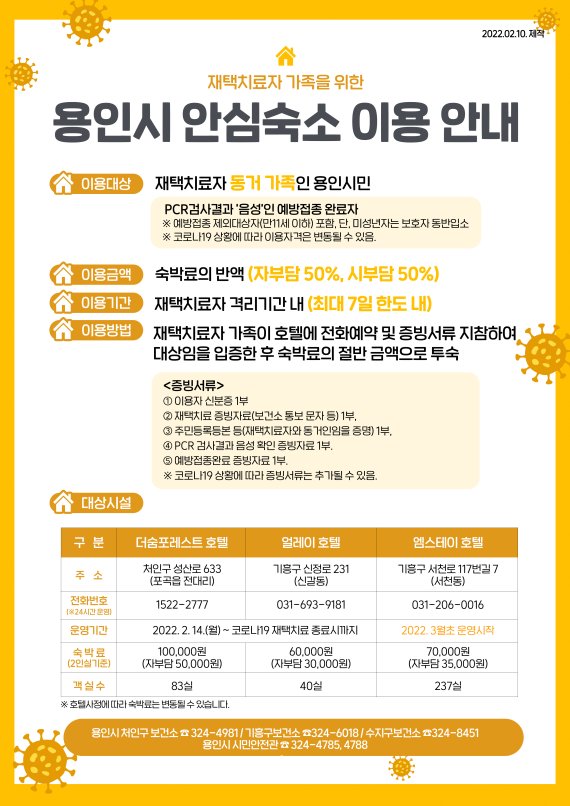 [용인=뉴시스]신정훈 기자 = 경기 용인시가 오는 14일부터 재택치료를 받는 확진자들의 동거 가족의 안전을 위해 관내 호텔 3곳과 협력해 ‘안심숙소’를 운영한다.