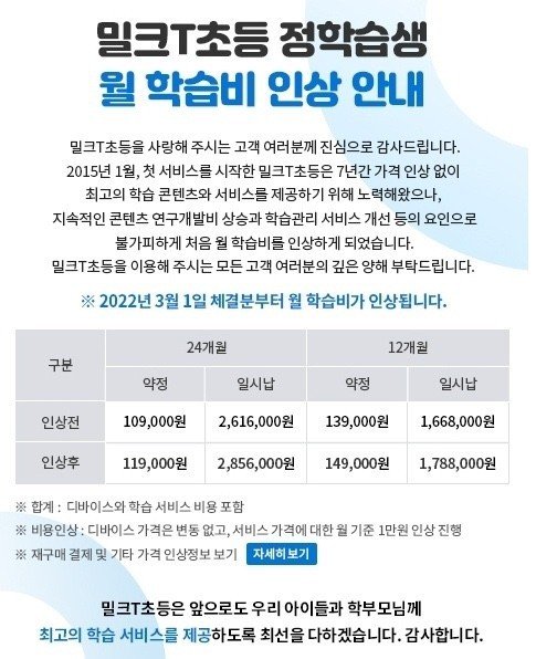 구체적으로 24개월 약정 기준 월 학습비는 10만9000원에서 11만9000원으로, 12개월 약정기준 월 학습비는 13만9000원에서 14만9000원으로 각각 오른다.