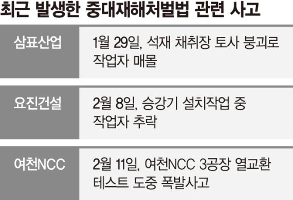 이번 여수 폭발사고를 포함해 중대재해법이 시행된 지 보름 만에 전국에서 3건의 중대산업재해가 발생했다.