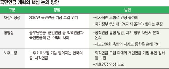 재정안정성을 보완하기 위해서는 결국 보험료율을 올릴 수밖에 없다. 이미 소득대체율(생애 평균소득 대비 노후 연금수령액 비중)은 2차례에 걸쳐 70%에서 40% 수준으로 낮췄다. 연금수령 나이도 60세에서 65세로 늦췄다. 남은 카드는 보험료율 인상뿐이다.