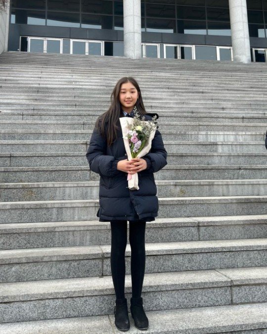 사진 속 딸은 꽃다발을 들고 환하게 웃고 있다. 엄마를 닮은 긴 다리를 뽐내며 남다른 비율을 자랑하고 있다.
