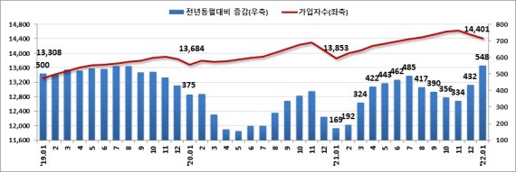 14일 고용노동부가 발표한 '고용행정 통계로 본 2022년 1월 노동시장 동향'에 따르면 지난달 말 기준 국내 고용보험 상시가입자 수는 1440만1000명으로, 전년 동월 대비 54만8000명(4.0%)이 늘었다.