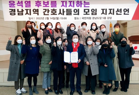 이날 오후 국민의힘 경남도당에서 열린 지지선언에는 윤석열 선대위 직능총괄부본부장 겸 복지보건의료지원본부장인 강기윤(창원시성산구) 국회의원과 간호사, 간호대학생 등이 다수 참석했다.