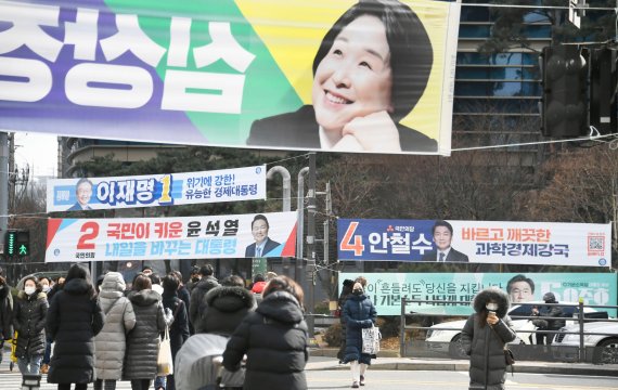 제20대 대통령선거 공식 선거운동 시작일인 15일 전국 곳곳에 대통령 후보들의 유세 현수막이 설치됐다.