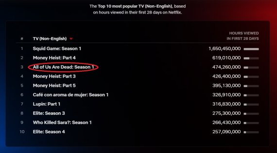 '지금 우리 학교는'은 지난달 28일 개봉 이후 누적 시청 시간 4억7426만 시간을 기록, 공개 이후 28일 간 기록을 집계하는 역대 흥행 순위에선 TV 비영어 부문 3위에 올랐다. 1위는 '오징어 게임'(16억5045만 시간), 2위는 '종이의 집:파트4'(6억1901만 시간)이다.
