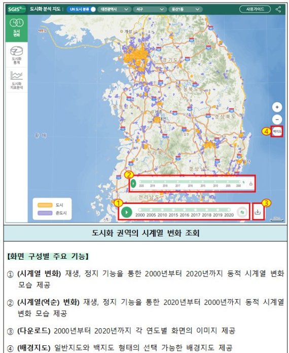 도시화 분석지도는 행정구역과 상관없이 UN 통계위원회의 도시분류 기준에 따라 2000년 이후 도시의 변화상을 지도상에서 직관적으로 보여준다. 도시의 확산과 소멸 과정을 분석하고 UN 기준의 도시·준도시 권역에 대한 2015년 이후 인구·가구·주택·사업체·종사자 등 데이터를 제공한다.