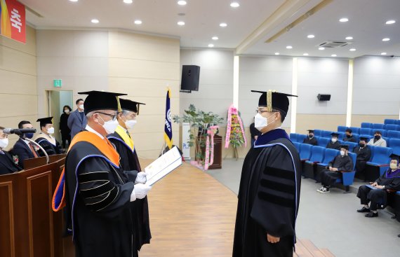 (청주=뉴스1) 이성기 기자 = 청주대학교(총장 차천수)는 18일 보건의료과학대학 청암홀에서 2021학년도 전기학위수여식을 개최했다.