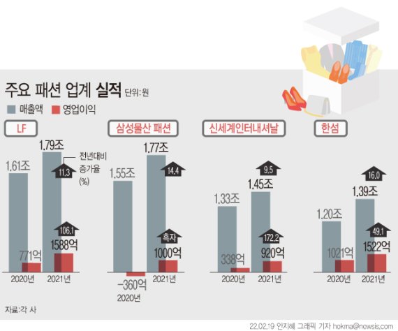 [서울=뉴시스] 이국현 기자 = 코로나19 확산으로 직격탄을 맞았던 패션업계가 지난해 실적 회복에 성공했다. 단계적 일상 회복으로 외출과 출근 수요가 늘어난 데다 소비심리까지 개선되면서 의류 구매가 증가한 데 따른 영향이다. 특히 수입 브랜드 확대와 고급화, 온라인 강화 전략도 핵심 소비층으로 부상한 MZ세대의 지갑을 열었다.