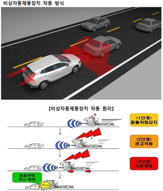 비상제동장치 의무화도 승용차와 소형화물차까지 확대(초소형차 제외)된다. 비상제동장치는 지난해 7월 버스와 중대형트럭에 먼저 의무화 됐고 이번 개정을 통해 전체 등록대수 중 90% 이상을 차지하는 승용차와 소형화물차도 적용을 받게 됐다.