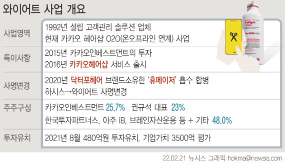 와이어트는 카카오 계열 헤어샵 플랫폼인 '하시스'가 전신이다. 지난 2020년 12월 닥터포헤어 브랜드를 소유한 회사 '휴메이저'를 흡수합병해 토탈헤어케어 서비스 기업으로 변신하며 사명을 '와이어트'로 변경했다. 이후 한국투자파트너스를 비롯해 브레인자산운용, 아주IB 등으로부터 480억원의 투자를 유치하는데 성공했다.