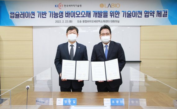 [진주=뉴시스] 정경규 기자 = 한국세라믹기술원은 22일 충북 오송 융합바이오세라믹소재센터에서 화장품 원료 개발회사인 라비오와 캡슐레이션 기반 기능성 물질 가용화 및 안정화 기술이전 계약을 위한 상호협력 협약식을 가졌다고 밝혔다.