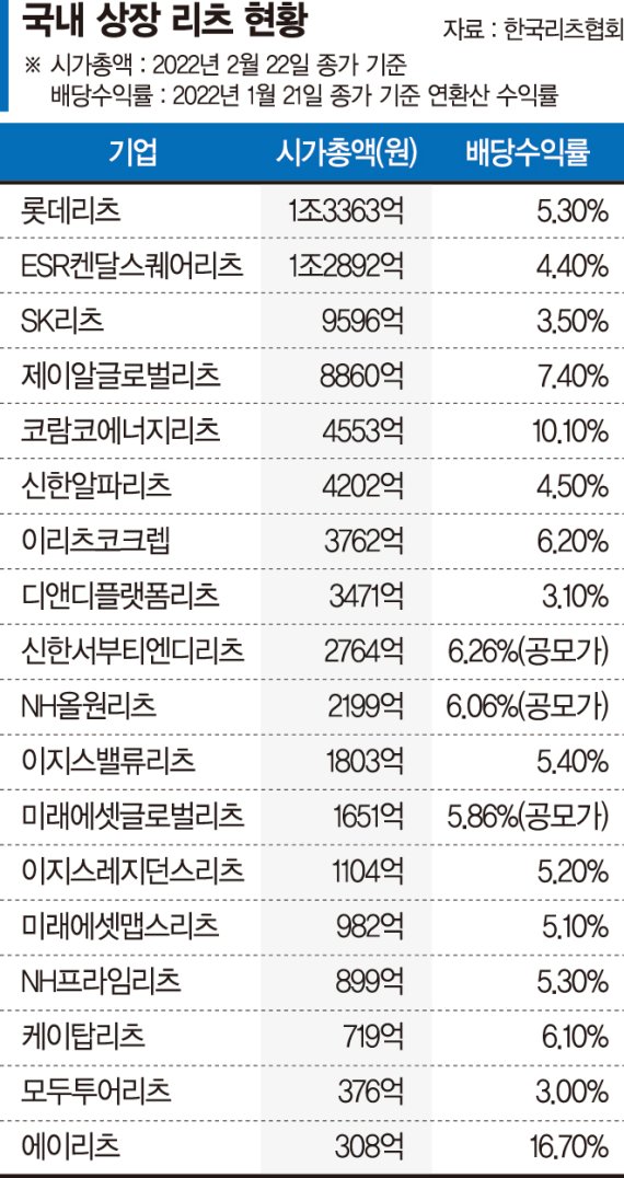 이경자 삼성증권 연구원은 "국내 리츠는 임차인이 우량해 안정적인 임대 수익을 얻을 수 있는 것이 특징"이라며 "국토교통부의 심사 과정과 인허가 절차가 엄격해 팬데믹에도 배당이 훼손되지 않고 상승하는 모습을 보여왔다"고 설명했다.