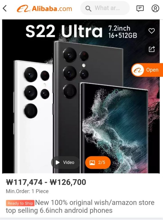 23일 중국 최대 전자상거래 업체인 알리바바에서는 갤럭시 S22 울트라 가짜폰이 약 12만원에 팔리고 있었다. '갤럭시 S22 울트라' 출고가격이 145만2000원(256GB)·155만1000원(512GB)인 점과 비교하면 터무니없는 수준이다.