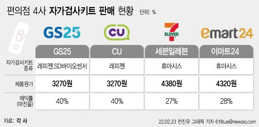 편의점에서 판매하는 자가검사키트의 마진율(매익률)이 업체마다 달라 점주들의 불만이 쏟아지고 있다.