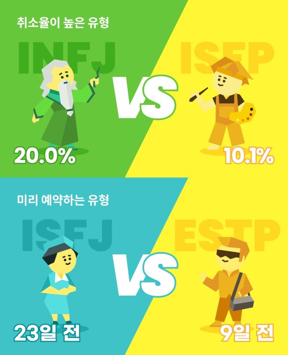 꼼꼼함을 추구하는 것으로 알려진 ISFJ가 가장 일찍 예약하고, 순발력이 뛰어나다고 평가받는 ESTP가 여행 시점에 가장 가깝게 예약했다는 사실에서 MBTI별 성격 유형이 여행 예약에도 비슷하게 나타나고 있다.