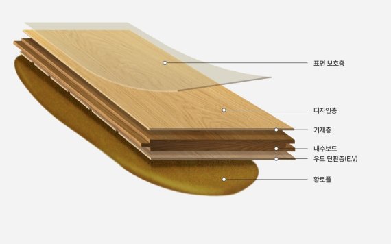 제품 하부 콘크리트 바닥 접촉면에는 기존 강마루에는 없던 특수 구조의 우드 단판층을 추가해 접착력 및 밀착력을 높였다.