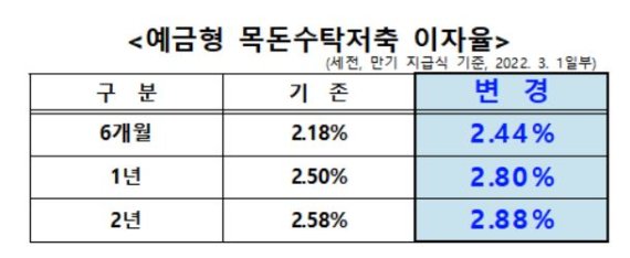 1년 수탁 시 기존 2.5%에서 2.8%로 인상, 최대 2년 기준 2.88%