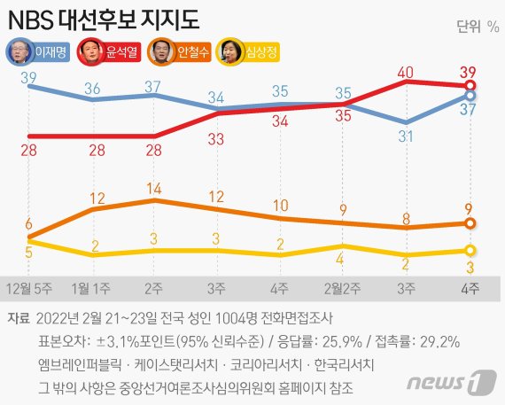 엠브레인퍼블릭·케이스탯리서치·코리아리서치·한국리서치 여론조사업체 4개사가 전국 만 18세 이상 성인 남녀 1004명을 대상으로 지난 21~23일 실시한 2월4주차 전국지표조사(NBS) '대선 후보 지지도'에서 윤 후보는 39%, 이 후보는 37%를 기록했다.
